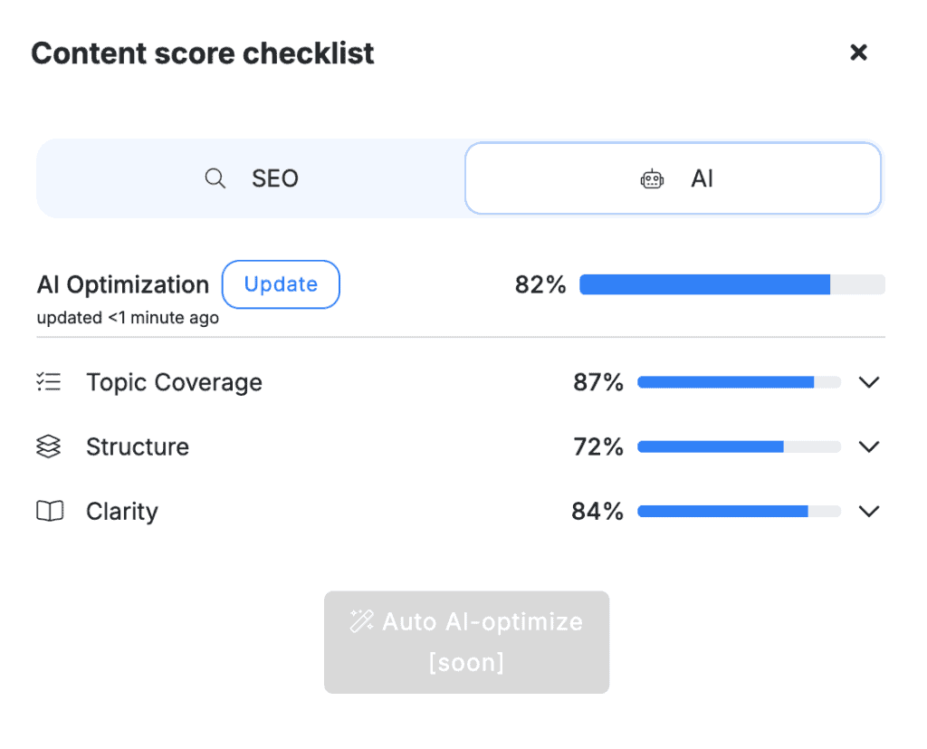 Next to your main SEO score, click the AI Score tab. You will see a detailed breakdown or checklist showing how your text measures up to the requirements of modern answer engines.