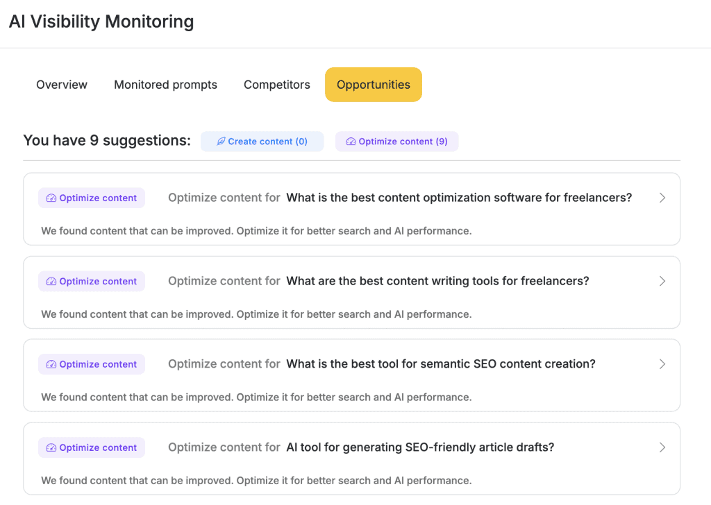 - Competitor Monitoring: See who Google SGE is citing instead of you and immediately update your AI Score to reclaim your spot.