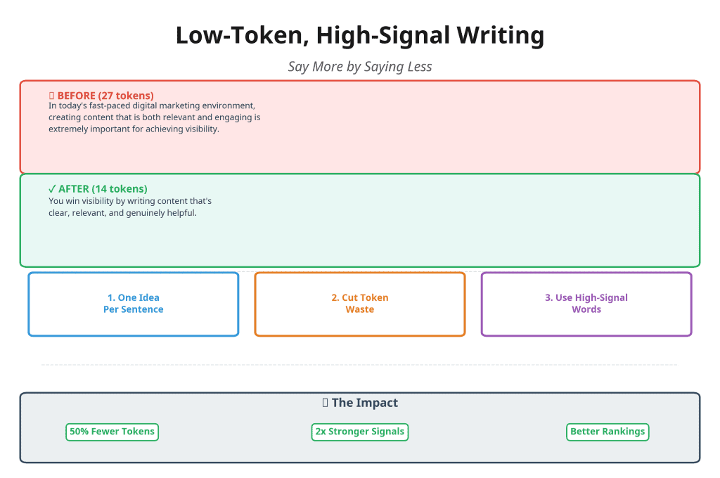 This guide will show you how to write low-token, high-signal sentences — short, powerful lines that deliver maximum meaning with minimum words. You’ll learn practical techniques, see real examples, and discover how even tiny edits can amplify your visibility in semantic search and generative AI results.