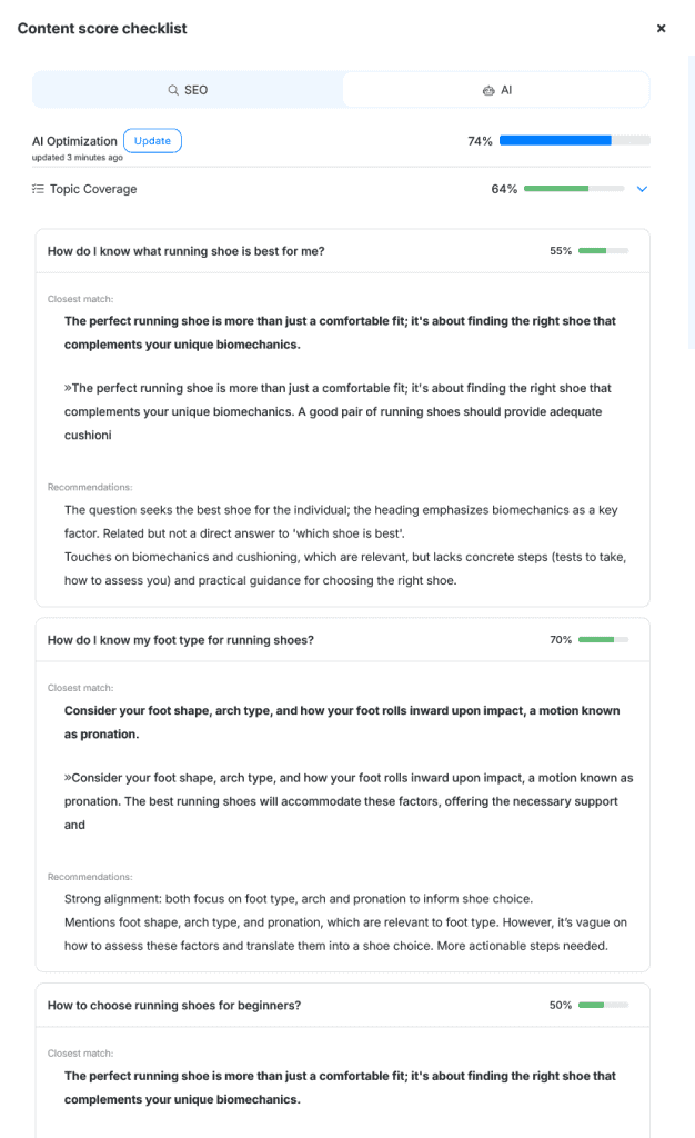 Complete keyword and topic coverage: address all essential and long-tail queries covered by top-performing content to strengthen visibility in both search engines and AI-generated results.