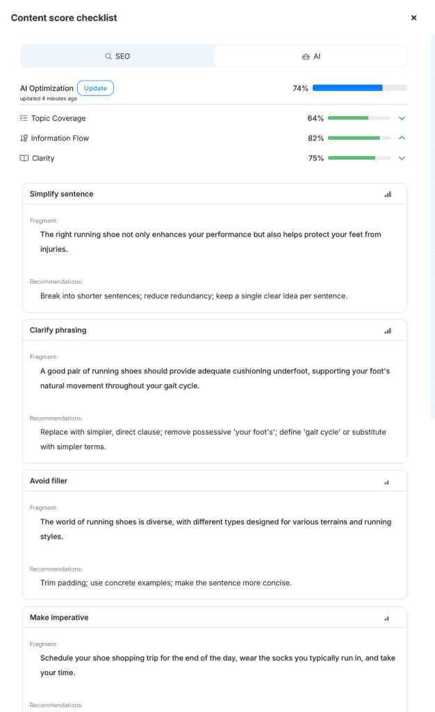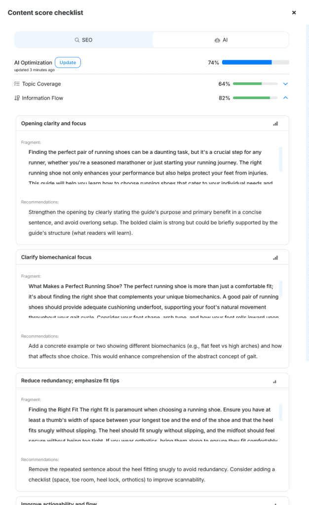 These core AI SEO metrics work together to build strong, well-rounded content. AI Topic Coverage ensures depth and completeness, Content Information Flow refines structure and logic, and Content Clarity enhances readability and understanding for both users and AI models.