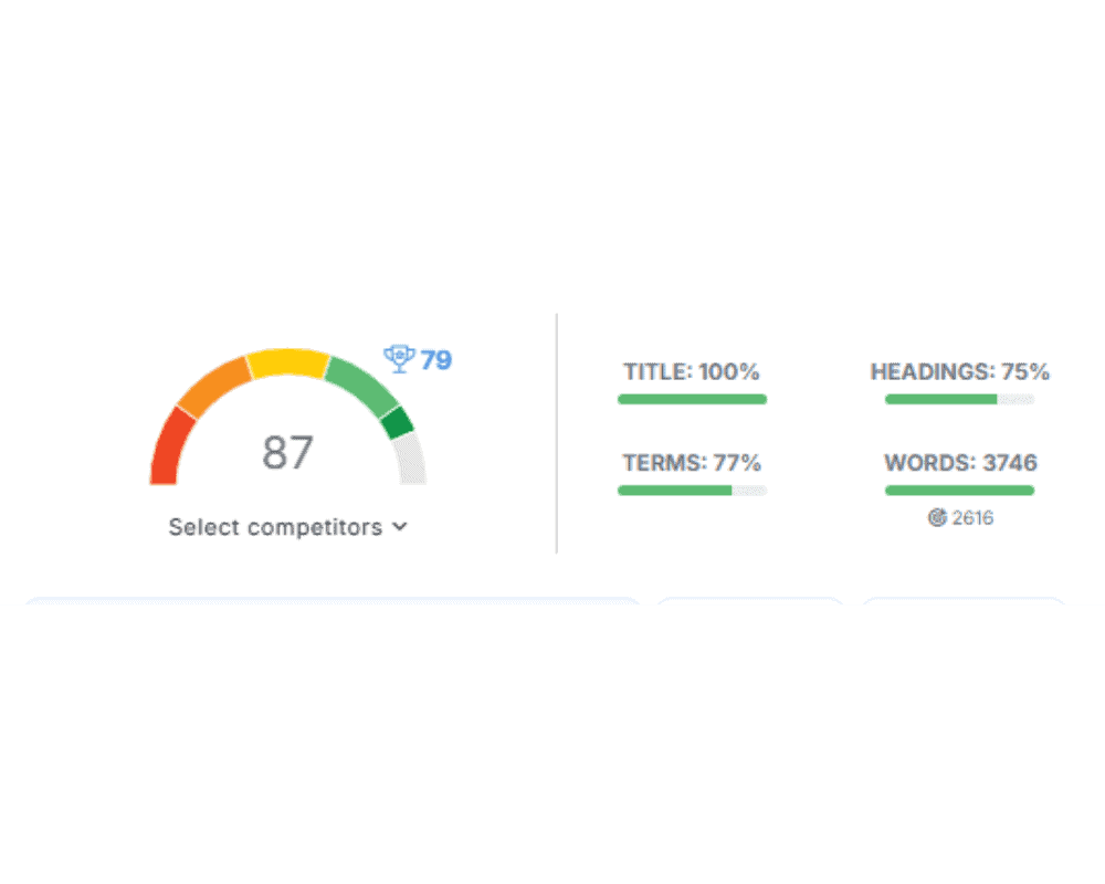 | Content Score | You have an SEO metric — you know what to improve to achieve better position | Seeing your score is lower than top competitors, you add missing terms, expand sections, improve headings |