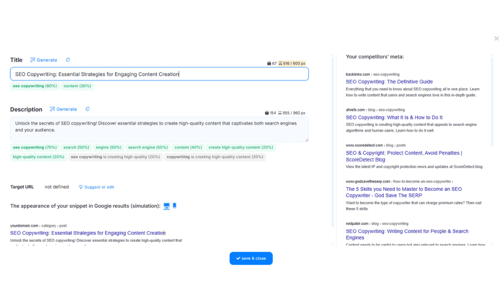 Neuronwriter helps plan titles, subtitles, meta descriptions to be attractive to users while meeting SEO requirements, containing keywords, being semantically sensible.