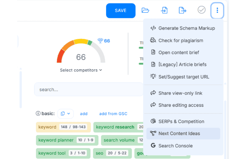 - Automatic H2/H3 heading suggestions based on competitor analysis.