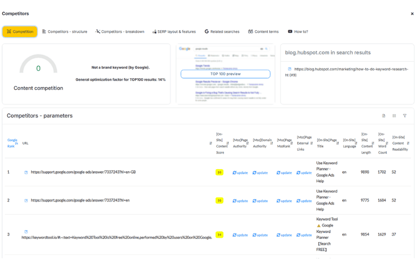 - Comparative dashboard — you see what the best in SERP achieve and what score you should aim for.